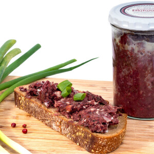 "Unsere Blutwurst die ist gut, wo kein Speck ist da ist Blut." - 300 Gramm leckere Blutwurst für den Feinschmecker.  Drei Monate haltbar, der Geschmack bleibt.