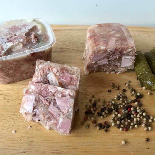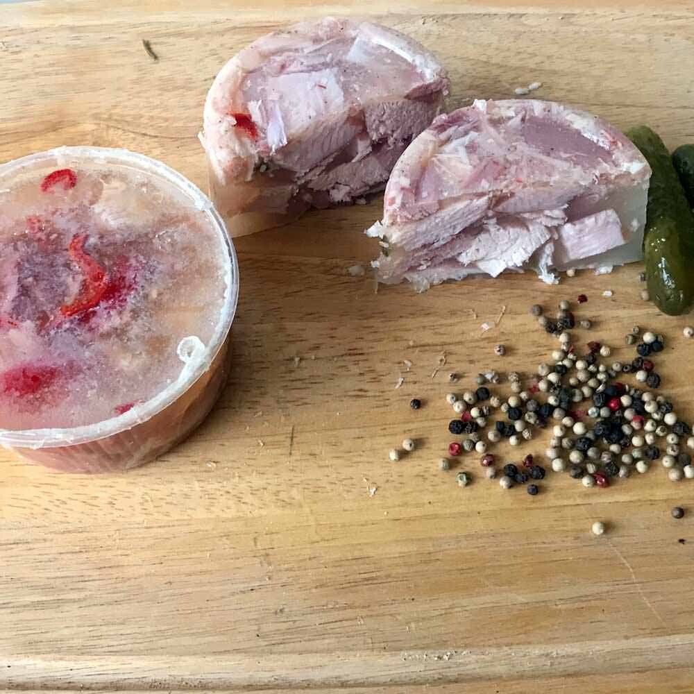 90% Schweinefleisch, Brühe (Wasser, Schweinefleisch, Gewürze), Aspik, Nitritpökelsalz (Konservierungsmittel E 250, Salz), Zwiebeln, Essig, Zucker